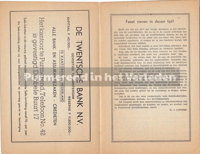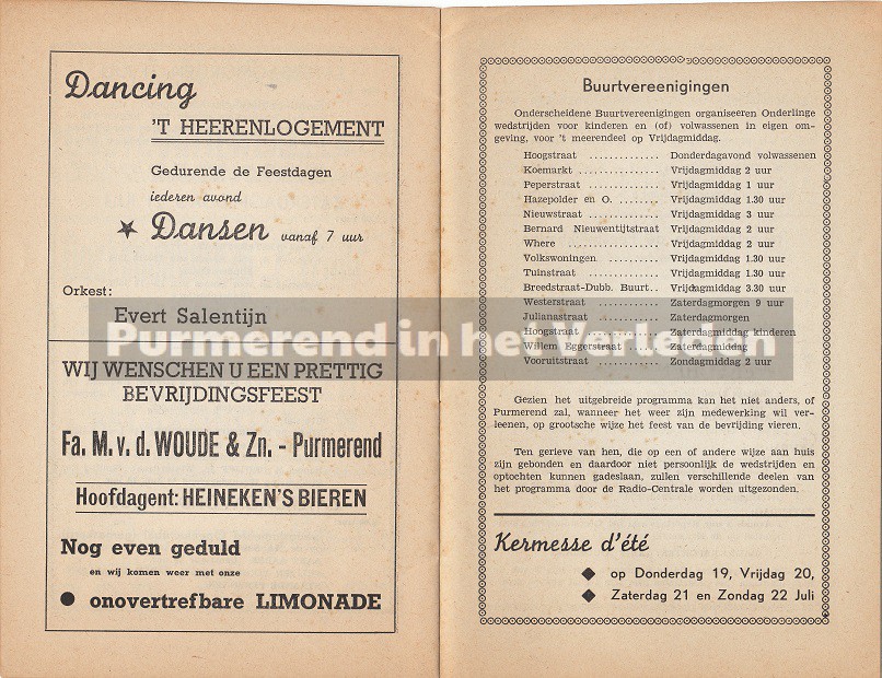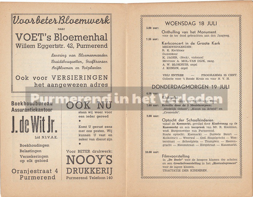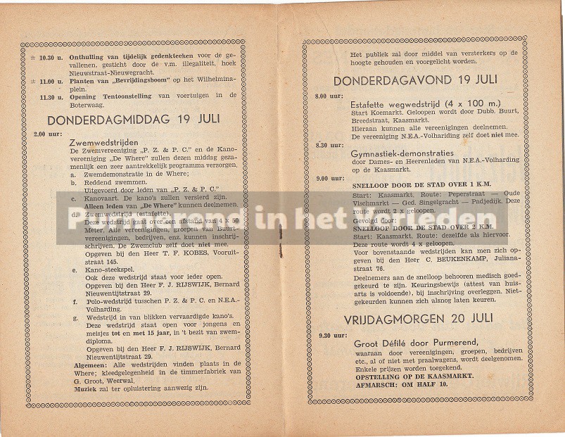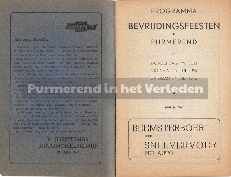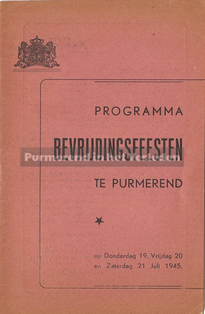 Op 19, 20 en 21 juli 1945 werd in Purmerend een groot feest georganiseerd ten bate van de bevrijding van de Duitse bezetting in Nederland. De 2e wereldoorlog was officieel afgelopen. Dan is het precies 70 jaar geleden dat de feesten in Purmerend gevierd werden. In 1945 werd speciaal voor deze festiviteiten een boekje gedrukt voor een ieder die deelnam aan het feest of als toeschouwer aanwezig was. U kunt dit lezen door de bladen aan te klikken.