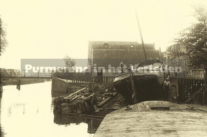 Ook zie je een schip op de helling. Jarenlang was Moerbeek het bedrijf die vele Purmerender schepen onderhield en repareerde. Ook was hij een vervend sportvisser en hield zich ook bezig met het geven van zwemles in de “Kom” aan de Beemsterdijk.